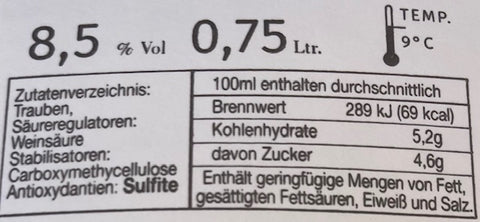 Inhalt: 6x0,75l · Alkoholgehalt: 8,5% vol · Restsüße: 45,6g · Säure: 7,4g